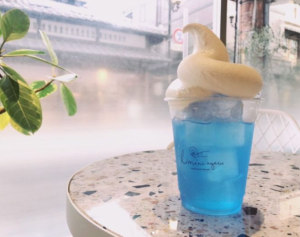 ソフトクリームソーダ スピルリナ 220円 夏らしい水色のクリームソーダは 着色料不使用× 「スピルリナ」という藻草から作られた スーパーフードで色づけをしています💙